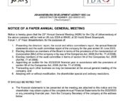 NOTICE OF A PAPER ANNUAL GENERAL MEETING Notice is hereby given that the 23 rd Annual General Meeting (AGM) for the City of Johannesburg of the above company will be held on 26 July 2024 at 09h00, at 33 Hoofd Street Braampark, Forum 1, 6th Floor, Braamfontein.
