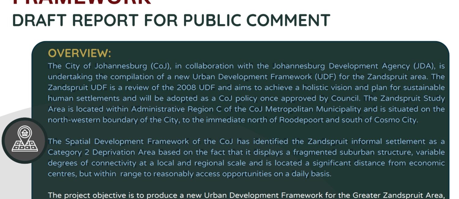 The City of Johannesburg (CoJ), in collaboration with the Johannesburg Development Agency (JDA), is undertaking the compilation of a new Urban Development Framework (UDF) for the Zandspruit area. The Zandspruit UDF is a review of the 2008 UDF and aims to achieve a holistic vision and plan for sustainable human settlements and will be adopted as a CoJ policy once approved by Council.